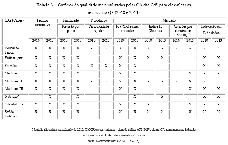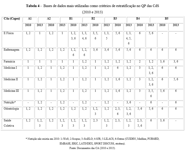 Cada CA define livremente os critérios para avaliar essas dimensões e, sobre essa base, classifica os periódicos nos estratos correspondentes. A tabela 3 mostra a distribuição dos critérios mais utilizados pelas CA nas avaliações de 2010 e 2013. Na Tabela 4, detalham-se as bases de dados mais utilizadas. Observa-se que há critérios considerados por todas as CA, especificamente, aqueles que caracterizam "formalmente" uma revista científica (técnico-normativos e revisão por pares). Não são concebidas publicações de qualidade que não atendam esses requisitos; estabelecem critérios mínimos para incluir um periódico nos estratos A1-B5 e consequente pontuação para os artigos nele publicados. Não atendimento coloca a revista no estrato C, cujos artigos não pontuam. Porém, esses critérios não definem a gradação dos estratos; essa considera critérios da dimensão de mercado, destacando pelo uso majoritário, os indicadores quantitativos e a indexação em bases de dados. Entre os indicadores quantitativos predomina o FI (JCR) utilizado por todas as CA; o índice H e as Citações por documento são muito menos empregados e sempre acompanhados pelo FI. Observou-se um crescimento dessa tendência de 2010 para 2013; Farmácia, Medicina I, II, III, e Odontologia incrementaram o valor do FI que delimita o nível superior e inferior dos estratos e a quantidade de estratos que exigem publicações com FI; Saúde Coletiva diminuiu a quantidade de estratos definidos por FI, mas incrementou seu valor; Enfermagem não incrementou o valor, mas a quantidade de estratos definidos por FI. Apenas Educação Física não realizou mudanças.