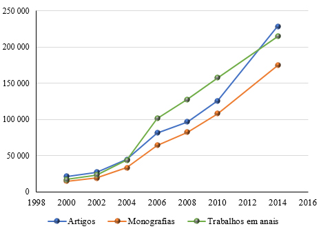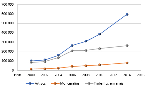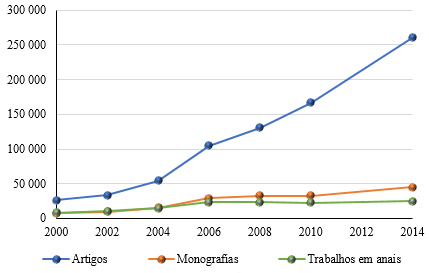 Porém, também traz questões problemáticas. Como afirmam Santos e Kobashi "(...) não se pode reduzir a atividade científica à produção, à circulação e ao consumo de artigos de periódicos e, muito menos, confundir o crescimento quantitativo de artigos com o desenvolvimento cognitivo da ciência".(29) Ao colocar as monografias e os trabalhos em anais num segundo plano, desconsidera-se uma parcela da produção científica das CdS que, apesar de ser intencionalmente desvalorizada, no censo de 2014 ainda representava 21 % do volume total da produção (Fig. 2).
