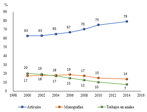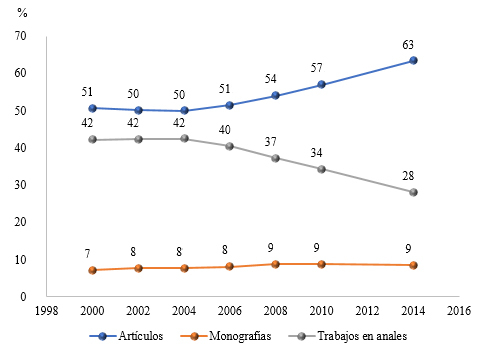 As figuras permitem identificar padrões similares nas práticas de publicação das CdS e das ciências "duras sem CdS" ao longo do período analisado Em ambos casos, os artigos constituem o principal tipo de produto, contribuindo majoritariamente e de forma crescente para a produção total. Nas CdS sua contribuição passou de 63 % no censo de 2000 para 79 % no censo de 2014 e nas ciências "duras sem CdS" de 51 % em 2000 para 63 % em 2014. Igualmente, a contribuição dos trabalhos em anais diminui sensivelmente em umas e outras; nas CdS decresceu de 20 % no censo de 2000 para apenas 7 % em 2014, ficando incluso abaixo das monografias; nas "duras sem CdS" o decrescimento passou de 42 % em 2000 para 28 % em 2014. Finalmente, a variação da contribuição das monografias é pouco acentuada; nas CdS oscila entre 14 -19 % e nas "duras sem CdS" entre 7-9 %.