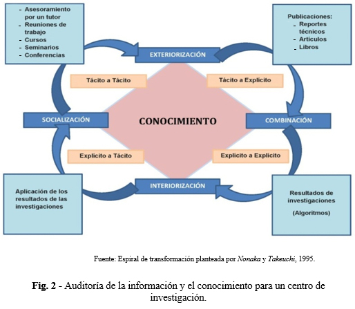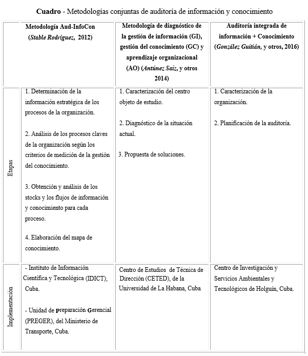 Antúnez Saíz, Franch León y Hernández Ruiz, en el año 2014, diseñaron una metodología de gestión de la información, el conocimiento y el aprendizaje organizacional, orientada a diagnosticar cómo un centro de estudio gestiona su conocimiento tácito y explícito en función de potenciar el aprendizaje organizacional a través de los procesos clave que desarrolla, y permite identificar las brechas donde se hace necesario actuar.(10) En el año 2016 González-Guitián, De Zayas-Pérez, y Martínez-Ríos, presentaron los resultados de la aplicación de una metodología integradora de auditoría de información y conocimiento, realizada en un Centro de Investigación del Ministerio de Ciencia, Tecnología y Medio Ambiente de la provincia de Holguín, dirigida a revisar la estrategia y la política de gestión de esos recursos.(11)