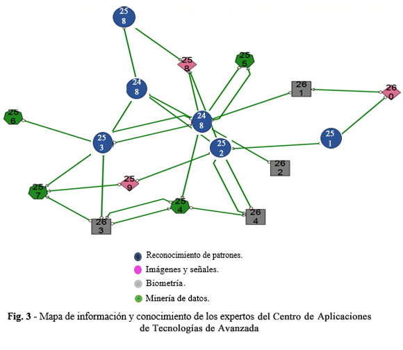 El mapa de información y conocimiento de los expertos se muestran en la figura 3, la cual posibilita a los investigadores más jóvenes, o de recién incorporación a la organización, identificar a los líderes de conocimiento de las diferentes temáticas. Cada nodo representa las áreas de investigación principales, asociadas a los especialistas expertos que realizan intercambios de información y conocimiento, en el sentido que lo indican las fechas.