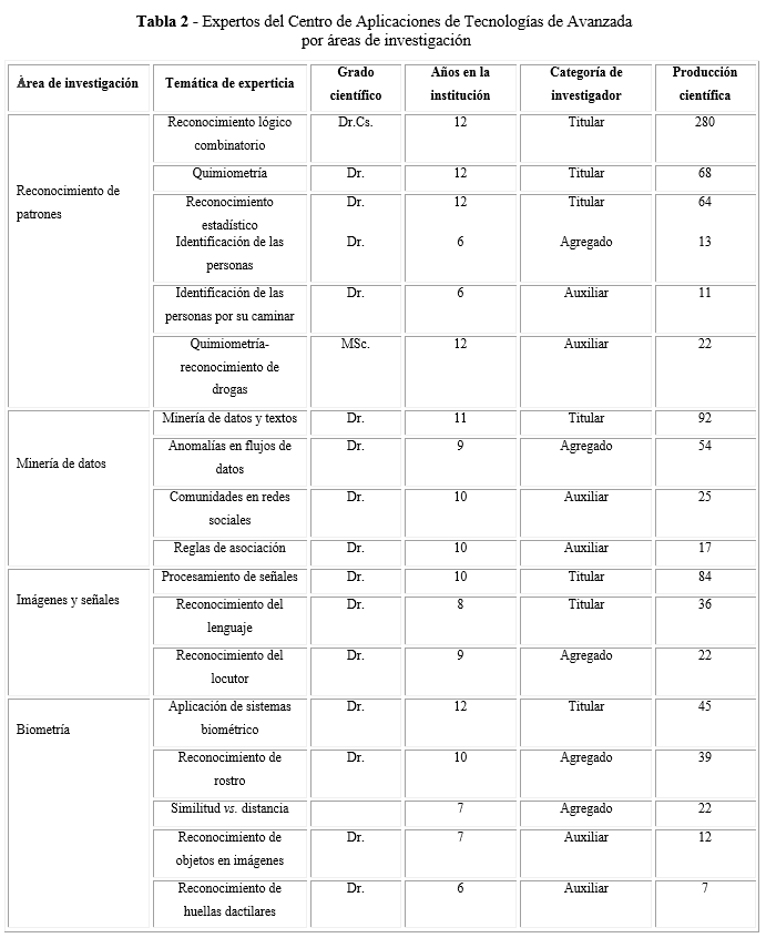 Se identificó la existencia de 18 expertos en la organización, como se muestra en la tabla 2, los cuales pertenecen a dos generaciones en la organización. Los expertos de la segunda generación se formaron en interrelación directa con los de la primera, los cuales se encuentran por área de investigación, pero no se posee una representación gráfica que muestre dónde se relaciona o intercambia información y conocimiento entre ellos. Todo el capital humano hace uso de la tecnología disponible, incluyendo los directorios que se poseen de cada uno de los investigadores y su producción científica, aunque en la entrevista realizada el 60 % considera que las tecnologías informáticas no son suficientes para desempeñar las nuevas actividades.