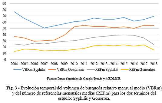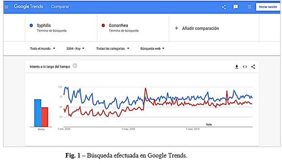 Así pues, está más que demostrado que Google es un motor de búsqueda que facilita información -incluso sobre salud- a cualquier persona, que a través de los resultados obtenidos puede acceder fácilmente a los documentos científicos existentes en la Red. Asimismo, dado el repunte que se viene observando, en el siglo XXI, de los datos de incidencia y prevalencia de las ITS curables, y sobre todo de la sífilis y la gonorrea, se decidió el estudio de estas enfermedades.(8) En consecuencia, el objetivo de este trabajo fue analizar la asociación entre la búsqueda de información sobre sífilis y gonorrea a través de Google, y la producción científica sobre estas dos infecciones de transmisión sexual.