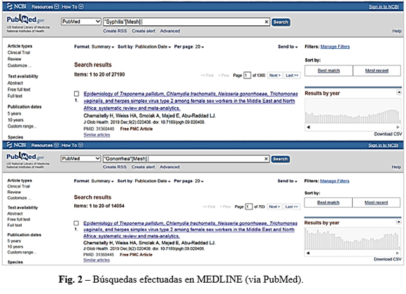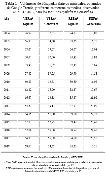 Se utilizó las palabras "Syphilis" y "Gonorrhea" en Google Trends como «término de búsqueda» y para intentar asemejarse a las búsquedas realizadas por personas no expertas no se utilizó ningún tipo de filtro (búsqueda libre). En MEDLINE se realizó la búsqueda utilizando los Medical Subject Headings (MeSH): "Syphilis"[MeSH] y "Gonorrhea"[MeSH]. El periodo de estudio fue desde el año 2004 (primer año en el que Google Trends ofrece los datos) hasta el año 2018. La fecha de consulta fue el 4 de abril de 2019.