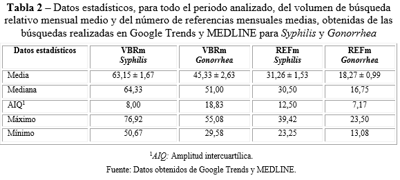 Al efectuar las búsquedas en Google Trends (Fig. 1) y en MEDLINE (Fig. 2) se pudieron obtener los resultados tanto para el VBRm desde Google Trends, como el REFm desde MEDLINE (vía PubMed), como muestra la tabla 1. Los estadísticos para todo el periodo analizado, tanto del VBR para Syphilis y Gonorrhea como para las REF, obtenidas de las búsquedas realizadas, pueden consultarse en la tabla 2.