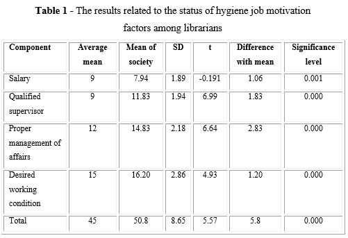 Considering the significance level that for all 4 components of hygiene job motivation is less than 0.05, it can be said that in all four components, the mean of the population has a significant difference with the average mean. However, table 1 shows that among hygiene job motivation factors, the mean of salary (7.94) is less than its average mean, while the mean of population in other components is higher than their average mean. In overall, the total mean of hygiene factors (50.8) is significantly (5.8) higher than the average mean.