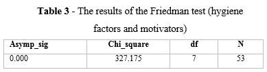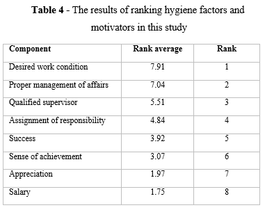 As the significance level (0.000) is less than 0.05, it can be stated that there is a significant difference between the mean of hygiene factors and motivators. The results of ranking hygiene factors and motivators are presented in table 4. The components of desired conditions of work, proper management of affairs, and qualified supervisor are in first to third ranks.