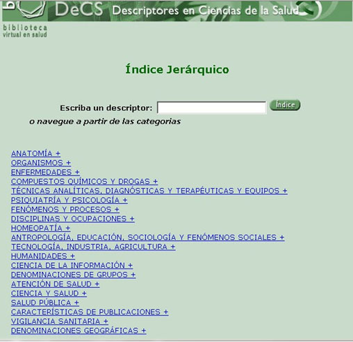 El MeSH y el DeCS sugieren relaciones entre los términos a partir de una estructura jerárquica de términos genéricos y específicos, que enlaza términos no autorizados y autorizados, así como los relacionados entre ellos. Los tesauros, al igual que el índice, ayudan a la localización de los términos más específicos. Sus referencias cruzadas remiten de los vocablos no autorizados muchas veces sinónimos o subordinados a los términos autorizados. Los tesauros referidos permiten recorrer una jerarquía de términos en dos direcciones, con vista a delimitar o ampliar los resultados de la búsqueda.