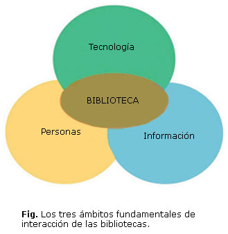 La biblioteca digital personalizable, además de las potencialidades disponibles en la biblioteca digital y la virtual, incluye la posibilidad de interacción e interactividad entre los usuarios, la cual servirá en todo momento de apoyo al proceso que se realice en las universidades. Propone la interacción en tres ámbitos:4 el tecnológico, el informacional y el personal (fig.), donde las personas son los estudiantes, profesores, investigadores, editores, profesionales de la información y usuarios. La tecnología es representada por bibliotecas digitales, repositorios, portales educativos y la información puede ser de acceso abierto y privado.