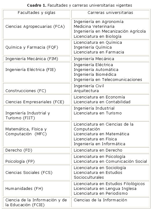 La UCLV, fundada en 1952, es un centro de educación superior con características multidisciplinarias. En ella se imparten 31 carreras universitarias agrupadas en 13 facultades. Se estructura en departamentos docentes, facultades y centros de investigación, estos últimos adscriptos a las correspondientes facultades o directamente a nivel de universidad. Es una institución en la cual están representadas la mayoría de las ciencias que se estudian en el país, y es la tercera universidad que abrió sus puertas al estudiantado cubano. Las facultades y carreras universitarias vigentes se muestran en el cuadro 1: