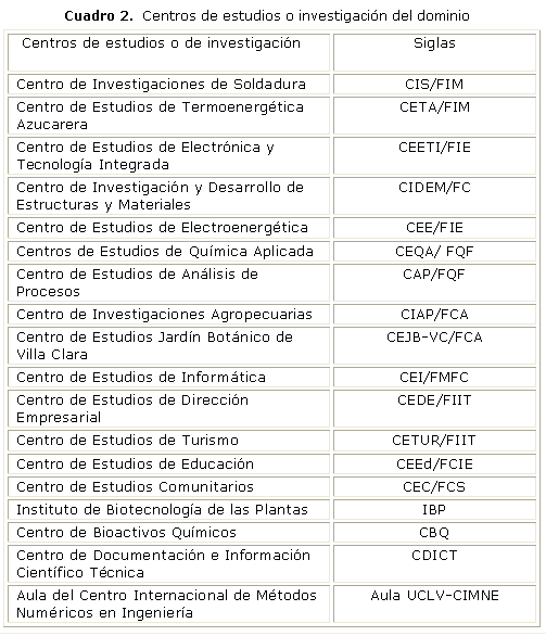 De los 17 centros de estudios o de investigación (CE-I) de la UCLV, dos de ellos, el Centro de Bioactivos Químicos y el Instituto de Biotecnología de las Plantas, no están adscritos a la estructura interna de las facultades, sino que por su relevancia están subordinados a la dirección general de la UCLV. En el estudio se incluyó también el Centro de Información Científico-Técnica de la UCLV. A continuación, el cuadro 2 presenta los centros de estudios o de investigación del dominio.