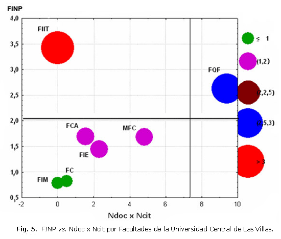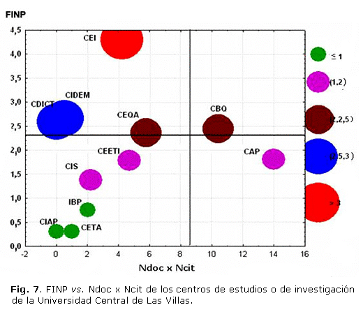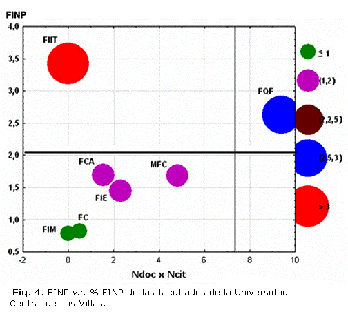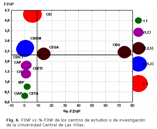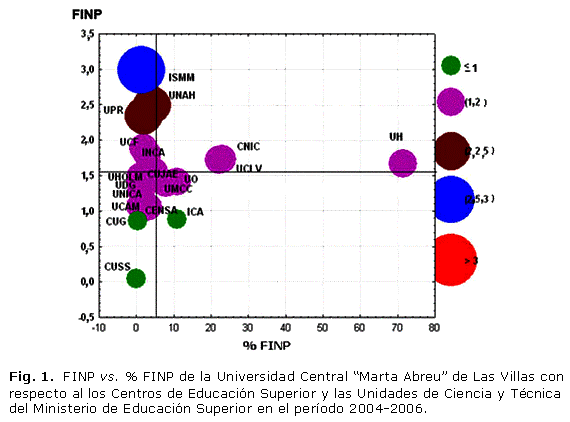 Si se toma como referencia el FINP calculado para el MES por Jorge Arencibia (años 2004-2006), de 1 581 con 1 223 publicaciones y se observa que la UCLV en este mismo período es de 1 725 con 157 publicaciones, se puede determinar el % FINP de la UCLV con respecto al MES, el cual resulta de 14,0 %. Este valor ubica a la UCLV por debajo de la Universidad de La Habana con 45,2 % y del Centro Nacional de Investigaciones Científicas con 14,5 % (fig. 1).