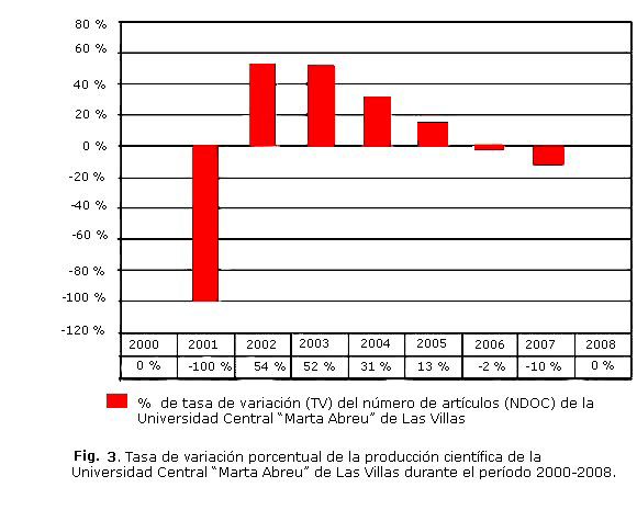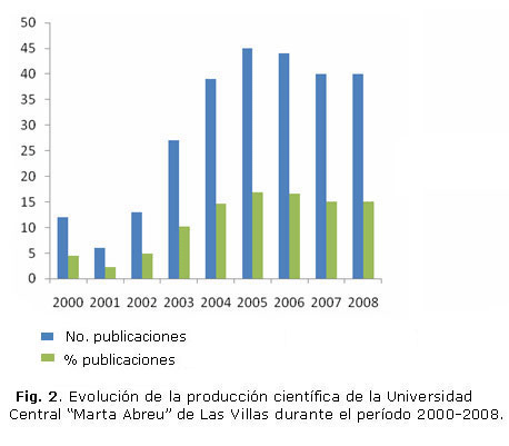La producción científica de la UCLV en las revistas del Institute for Scientific Information (ISI) parte de una pequeña cifra de publicaciones en el año 2000. A partir del 2002 creció monotónicamente hasta el año 2005, el cual resultó ser el de mayor productividad. En los años ulteriores se mantiene aproximadamente constante.