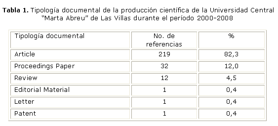 La tipología documental revela las diversas maneras de representar los resultados de las investigaciones. En el caso de las revistas, la producción de artículos favorece la visibilidad del dominio. Que el 82,3 % de artículos publicados en el período fueran citados fue un resultado muy favorable para la institución (tabla 1).