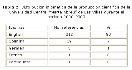 En las publicaciones analizadas predomina el idioma inglés, lo que representa el 80 % de las publicaciones. El resto de los idiomas se encuentran pobremente representados: en idioma español el 7 %, en alemán solo tres publicaciones y en francés y portugués solo una (tabla 2).