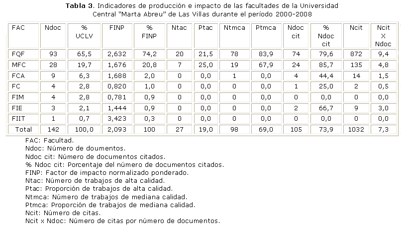 Las facultades de la UCLV produjeron un total de 142 artículos en revistas de la corriente principal. La media alcanzada por el FINP es de 2,093, con 19 % de trabajos clasificados como de alta calidad (tabla 3). En cambio, el 69,0 % de las publicaciones clasificaron como trabajos de mediana calidad. El 73,9 % de las publicaciones fueron citadas y recibieron un total de 1 032 citas, para una media de citas por documento de 7,3, superada únicamente por la Facultad de Química-Física (FQF), ya que las restantes facultades estuvieron muy por debajo del valor medio.