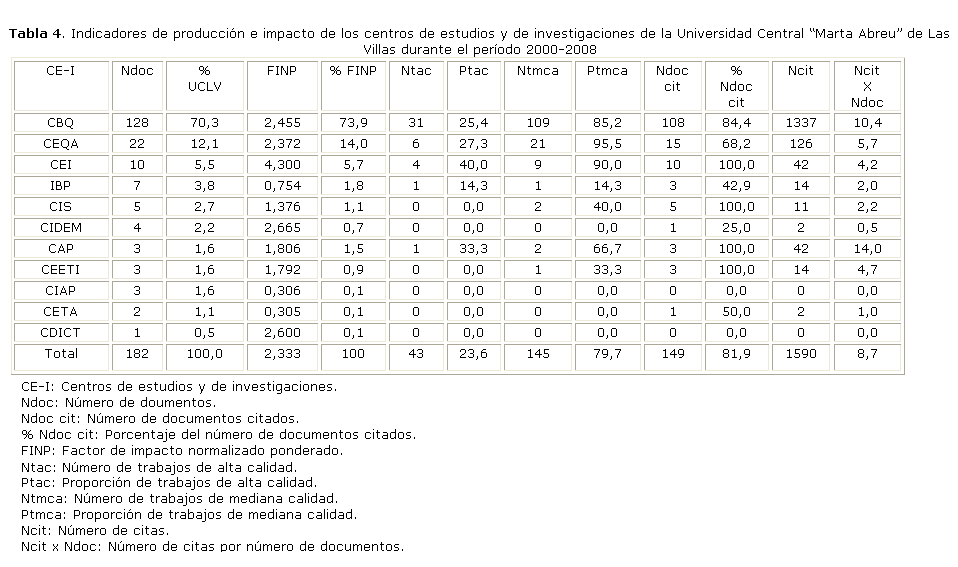 El comportamiento de la producción científica de la UCLV en la etapa comprendida entre los años 2004 y 2006, seleccionada con fines de comparación, ubica a esta institución en la tercera posición entre los centros de educación superior y unidades de ciencia y técnica del MES, por su productividad y visibilidad. Un total de 157 publicaciones en revistas de la corriente principal obtuvieron un factor del impacto normalizado ponderado (FINP) de 1 725. Se destaca el incremento de la producción científica de la universidad en ese período con respecto al resto del país, así como el hallazgo de más de 50 % de trabajos de alta calidad.8