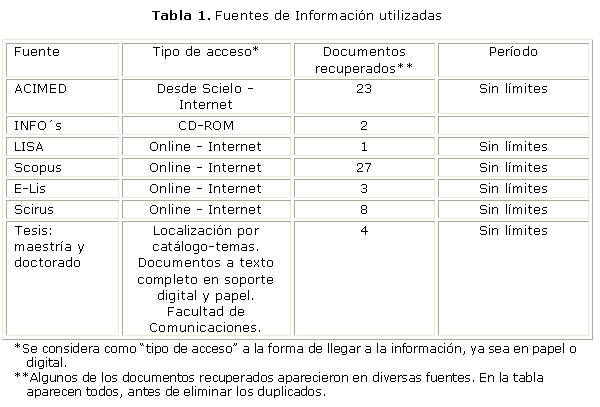 Para identificar los aspectos fundamentales de la investigación y/o la práctica en el tema de la evaluación de bibliotecas, se realizaron búsquedas en las fuentes que aparecen en la tabla. En ella también se especifican el tipo de acceso y el período que se abarcó para cada fuente. Estas fueron seleccionadas tomando en consideración que cada una de ellas puede reflejar el estado de la investigación que se hace en Cuba; para esto se tomaron en cuenta las siguientes especificaciones:
