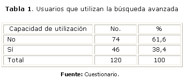 En la tabla 1 se puede observar que 74 usuarios de los 120 encuestados no utilizan las opciones de búsqueda avanzada, lo que representa 61,4 %.