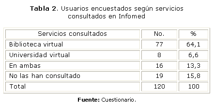 En la tabla 2 se muestra que de los 120 profesionales que se encuestaron, 77 (64,1 %) han consultado información en la Biblioteca Virtual de Salud (BVS) y solo 8 en la Universidad Virtual de Salud (UVS), que representa el 6,6 %.