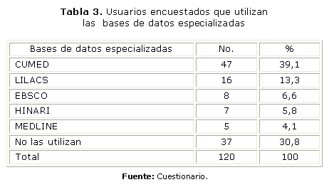 De los 120 profesionales de la salud encuestados, el 39,1 % conoce la base de datos CUMED, la cual registra la producción científica cubana en el campo de la medicina y sus ciencias afines; pero no conocen otras bases importantes, como son LILACS, EBSCO, HINARI y MEDLINE; 37 usuarios (30,8 %) no utilizan las bases de datos bibliográficas, que son las que relacionan y organizan la información pertinente y validada. El acceso a las demás bases de datos es escaso, como se señaló anteriormente, y la causa es el desconocimiento en cuanto a cómo utilizarlas. El gran cúmulo de información internacional que está disponible en estas fuentes validadas y actualizadas son a texto completo, y representan una gran ayuda en las investigaciones y en el trabajo diario de los profesionales de la salud cubana (tabla 3).