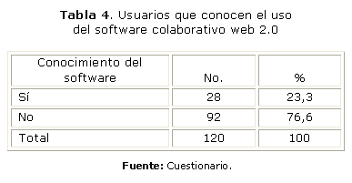 En la tabla 4 se puede observar que conocen el uso del software colaborativo Web 2.0 y sus herramientas para compartir conocimientos solo 28 profesionales (23,3 %), y es muy llamativo que 92 usuarios (76,6 %) no conocen ni usan el software colaborativo.