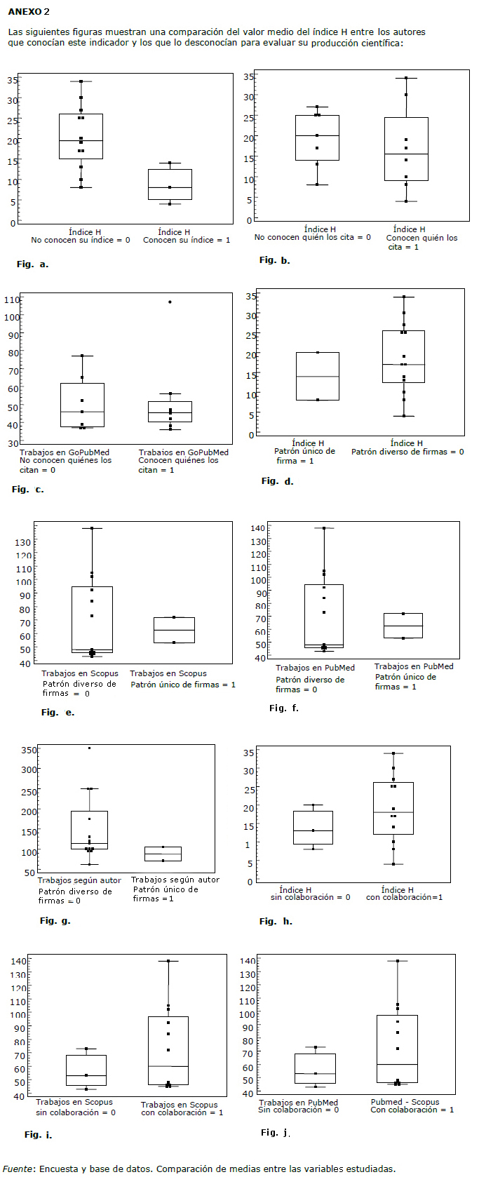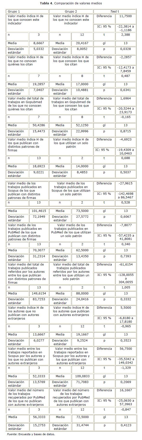 Cuando se comparó el valor medio del índice H de los que conocen este propio indicador con los que no conocían de la existencia de esta forma de evaluar su producción científica, se encontró que la diferencia era significativa. Llama la atención que los autores con mayor índice H eran los que desconocían este indicador.