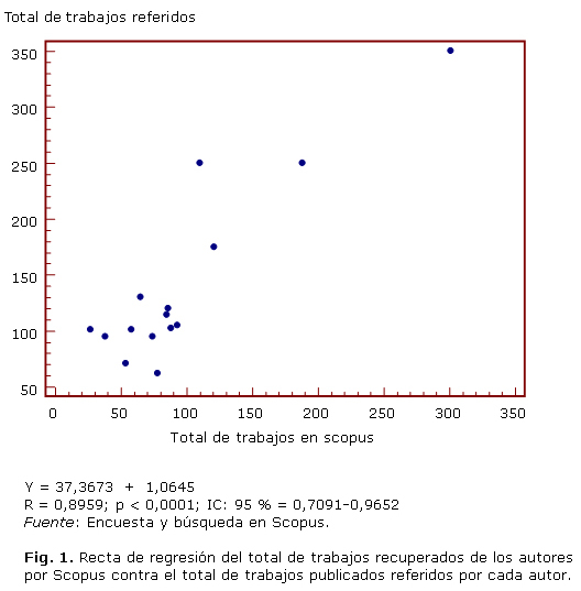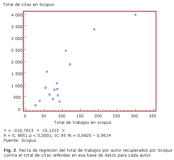 A medida que aumenta la visibilidad de la revista porque está en una buena base de datos, hay más oportunidad de que un trabajo sea citado. Por eso en la tabla 4 a mayor número de trabajos recuperados en Scopus hay un incremento en el número de citas. En la figura 1 se muestra la recta de regresión de la productividad de cada autor contra el total de citas en la base de datos Scopus.