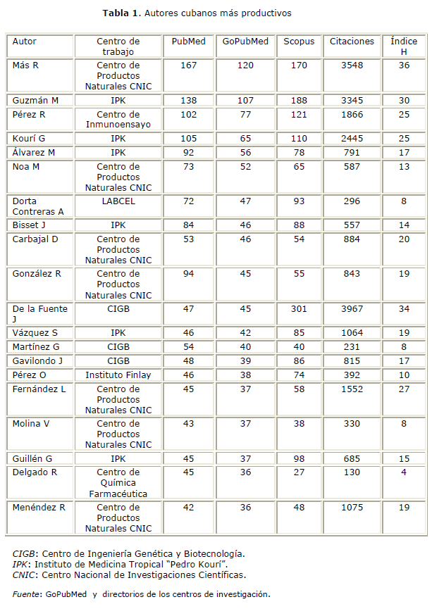 Pudiera suceder que existan autores cubanos con un número mayor de publicaciones que las que han permitido que estos autores estén listados como los más productivos. Este listado se ha obtenido de PubMed, por lo que autores que publican en revistas que no reconoce esta base de datos no aparecen en este.