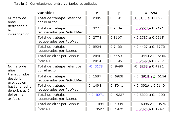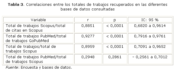 Cada base de datos admite un número determinado de revistas. Se conoce que la base de datos que aparece en el Web of Sciences perteneciente a la firma Thomson-Reuters es la más exclusiva y elitista y admite menos revistas que PubMed, y que la base Scopus es la que admite el mayor número de revistas e incluye las revistas del Web of Sciences y de PubMed. En la tabla 3 se aprecia que existe una correlación significativa entre los trabajos de los autores que aparecen en PubMed y GoPubMed, precisamente porque una se deriva de la otra. Sin embargo, esta correlación no fue significativa entre PubMed y Scopus para nuestra muestra.