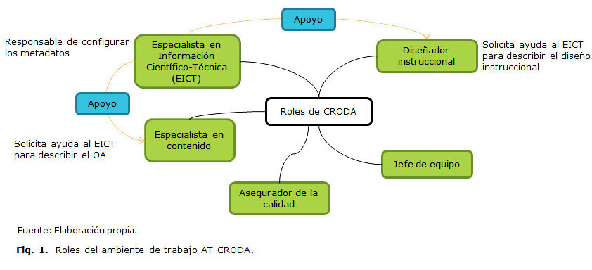 Durante la elaboración de OA, la necesidad de colaboración entre los docentes se acrecienta, por las características propias de este tipo de recurso educativo. En su creación deben ser tenidos en cuenta aspectos técnicos, pedagógicos y de contenido, razón por la cual el trabajo de un equipo multidisciplinario conformado por personas especializadas en diferentes áreas, donde cada una aporta sus conocimientos específicos, es de mucha importancia. En este sentido, en AT-CRODA se plantea la presencia de un equipo compuesto por los roles que se muestran en la figura 1. Es válido aclarar que una misma persona puede realizar las actividades asociadas a diferentes roles.