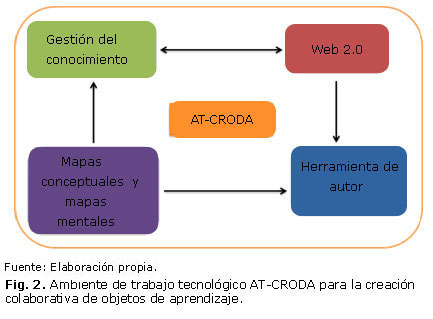 Por otra parte, propiciar la gestión del conocimiento durante el desarrollo de los OA, el uso de herramientas de la Web 2.0 para contribuir a la comunicación de los autores, la utilización de mapas mentales y conceptuales y el empleo de una herramienta de autor pueden complementar las facilidades de las iniciativas mencionadas; de ahí que en este artículo se presente un ambiente de trabajo denominado AT-CRODA, que integra una herramienta de autor, herramientas de la Web 2.0, la gestión del conocimiento y los mapas mentales y conceptuales en aras de facilitar la construcción colaborativa de OA. Las Instituciones de Educación Superior (IES) pueden verse beneficiadas con este ambiente, ya que brinda facilidades para la elaboración de OA que pueden resultar de mucha utilidad.