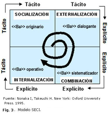 Modelos como SECI (Socialización-Externalización-Combinación-Internalización) y el de Aprendizaje Organizacional han sido desarrollados para realizar la gestión del conocimiento. De estos, SECI es el más conocido e implantado a nivel internacional y es el propuesto para desarrollar la gestión del conocimiento en AT-CRODA. Los autores de este modelo dejan clara su percepción acerca de la complementariedad de los tipos de conocimientos, al plantear que la creación de este es un proceso continuo de interacciones dinámicas entre el conocimiento tácito y el conocimiento explícito.10 Este modelo está formado por tres elementos: el proceso SECI (fig. 3), el concepto de «Ba» (espacio compartido donde se producen interacciones del conocimiento o espacios interpersonales y colectivos para compartir, crear y aprender conocimientos) y los activos de conocimiento, referidos a los recursos específicos de la organización que son imprescindibles para crear valor.