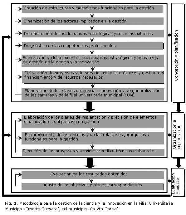 La gestión de este proceso universitario en la Universidad de Holguín "Oscar Lucero Moya", a semejanza con las demás universidades cubanas, se sustenta de igual manera en las teorías generales de las ciencias de la dirección, para lo que se utiliza la planeación estratégica. Tal es el caso del programa estratégico implementado en esta a partir del año 2004, liderado por Ronda18 y, más recientemente, el manual de procedimientos elaborado por Pérez19, este último apoyado también en las principales teorías, enfoques y técnicas de la dirección. Además, teniendo en cuenta las relaciones administrativas y metodológicas que necesariamente se establecen entre esta universidad y las filiales universitarias municipales adscritas a ella, es obvio suponer que la gestión de la ciencia y la innovación en estas se realiza también sustentada en esta plataforma teóricometodológica. Esto permite afirmar que no hay herramientas metodológicas específicas y flexibles para la gestión universitaria de la ciencia y la innovación que integren las ciencias de la dirección con los componentes específicos del proceso en una plataforma conceptual previamente definida en cuanto al rumbo de nuestra escuela de ciencias de la educación, que puede ser una metodología de gestión que integre, estructure y sistematice adecuadamente los conocimientos científicotecnológicos necesarios para lograrlo.