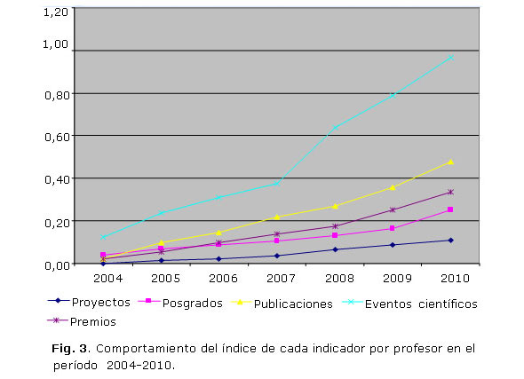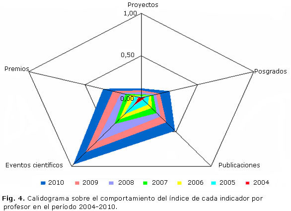 Para ilustrar que los crecimientos obtenidos en los indicadores evaluados no dependen del posible incremento del total de profesores se determinaron los índices de estos por profesor y se graficaron según se muestra en la figura 3. Como se puede observar, todos los indicadores presentan un incremento sostenido en sus índices con respecto a los profesores. Para confirmar esta conclusión se elaboró el calidograma sobre el comportamiento del índice de cada indicador por profesor en el período 2004-2010 (Fig. 4).