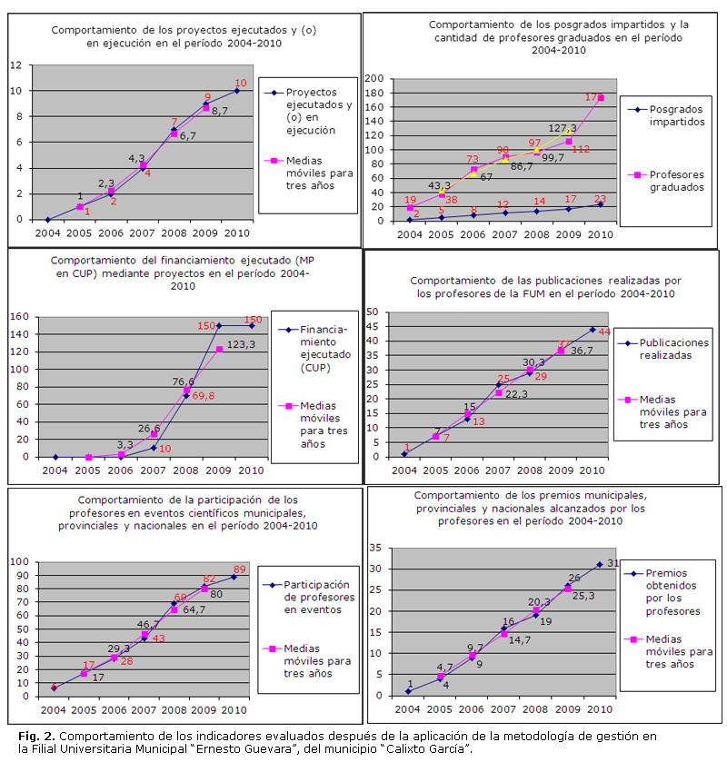 Del análisis realizado a la información recopilada una vez procesados mediante los métodos estadísticos enunciados se constató que los seis indicadores evaluados crecieron sostenidamente en el período 20042010, lo cual fue corroborado con la aplicación del método de estimación de tendencias de las medias móviles para tres años (Fig. 2).