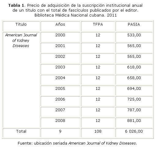 La tabla 1 muestra un ejemplo de un título adquirido en biblioteca, al que se le tomó el precio de adquisición de la suscripción institucional y el total anual de fascículos publicados por el editor directamente de la publicación seriada para la serie de años escogidos, lo que demostró que es posible obtener los precios originales de los títulos por el método propuesto y se logra un registro de los precios que pueden ser un referente a otras instituciones de la red.