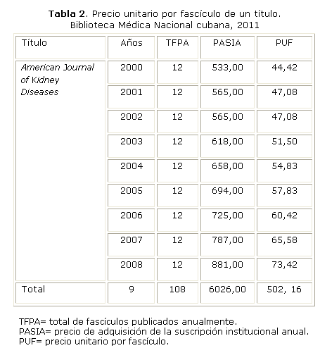 Como muestra la tabla 2, el precio unitario por fascículo (PUF) se obtuvo al dividir el precio de adquisición de la suscripción institucional anual (PASIA) entre el total de fascículos publicados anualmente por el editor (TFPA).