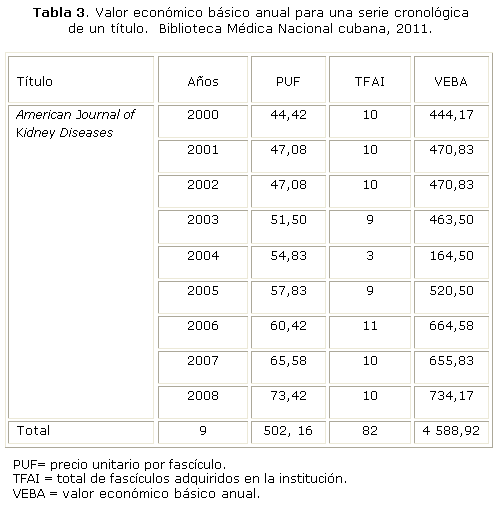 La metodología propuesta permite en la Biblioteca Médica nacional cubana estimar el valor económico básico anual de la colección impresa de publicaciones seriadas, cuantificando el dinero invertido en el bien adquirido y su depreciación.