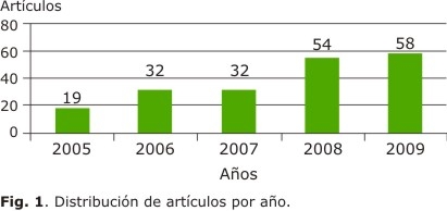 En el período estudiado se publicaron 195 artículos en la Revista de Ciencias Médicas de La Habana. Se observó un incremento paulatino en el número de artículos publicados, de 19 en el 2005 a 58 en el 2009 (Fig. 1), lo que refleja el resultado del incremento en la cantidad de números de la revista, de dos durante los años 2005 al 2007 a tres durante los años 2008 y 2009, así como de la cantidad de artículos por número que osciló entre 10 y 25 artículos como consecuencia del aumento del colchón editorial de la revista.