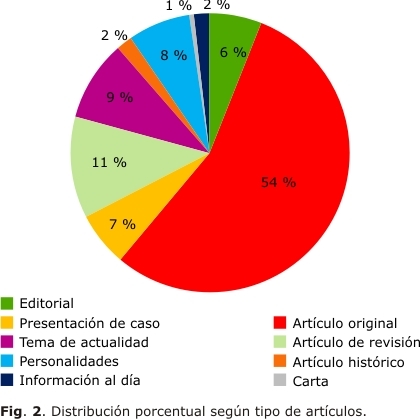 La distribución porcentual según tipo de artículos se aprecia en la figura 2, donde se observa que los % de los temas de actualidad y los estudios sobre personalidades son casi iguales a los artículos de revisión. Este resultado demuestra que en cada número de la revista se publica generalmente un artículo de revisión y un tema de actualidad, a lo que se suma que en el 2008 se editó un número especial con solo estos dos tipos de artículos. A partir del año 2007 se creó en la revista una sección fija sobre personalidades, en la cual se publican dos artículos en cada número.