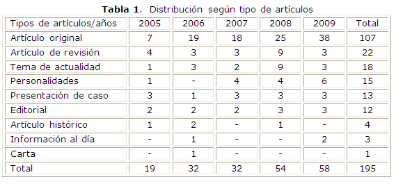 Al examinar la distribución por tipos de artículos (tabla 1) se observó que predominaron los originales (107), lo que se corresponde con la misión de esta publicación de difundir los resultados de las investigaciones realizadas en el sector de la salud, y representó el 54,9 %, seguido de los artículos de revisión y los temas de actualidad.