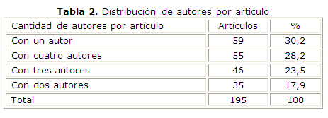 A nivel mundial, la tendencia general en cuanto a la autoría en revistas científicas, de la cual Cuba no está exenta, es el aumento de artículos escritos por varios autores, lo cual se ha podido demostrar en este estudio donde 136 artículos fueron escritos por dos o más autores, lo que representa el 69,7 % del total de artículos publicados, y solamente 59 de ellos fueron elaborados por un autor (tabla 2).