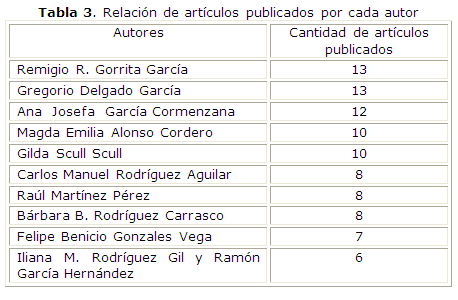 Los autores que más han publicado en el período estudiado en la revista son Remigio R. Gorrita García, del Policlínico Docente "Rafael Echezarreta", con 13 artículos; Ana Josefa García Cormenzana, de la Facultad de Ciencias Médicas del Este de La Habana, con 12, y Magda Emilia Alonso Cordero, del Policlínico Docente "Luis Li Trijent", de Guines, y Gilda Scull Scull, de la Facultad de Ciencias Médicas del Este de La Habana, con 10 cada uno. Se desea aclarar que no se incluyó aquí al autor Gregorio Delgado García, a pesar de tener 13 artículos, porque este autor, desde el año 2007, escribe la sección fija de Personalidades. La relación de artículos publicados por cada autor (los 10 primeros) se muestra en la tabla 3.