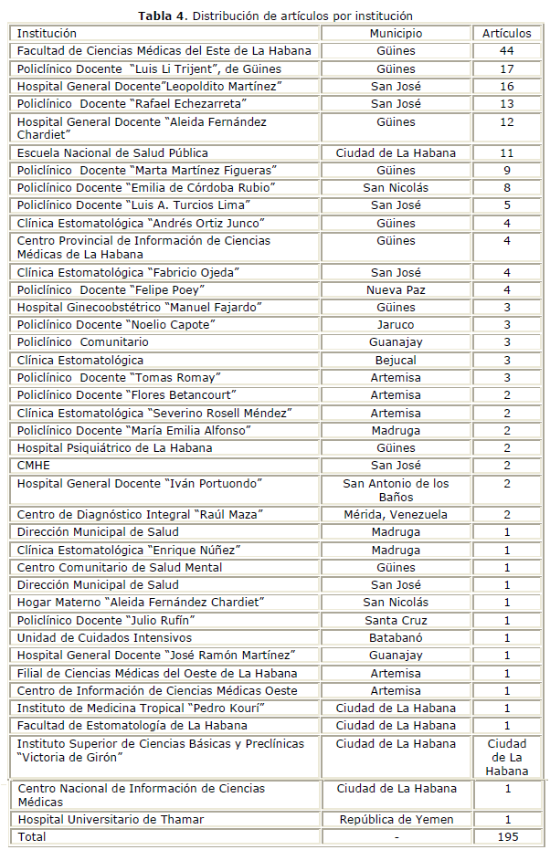 Al analizar la cantidad de instituciones se observó que en el período estudiado 40 entidades publicaron sus trabajos en la revista. Las instituciones que más artículos han publicado son: la Facultad de Ciencias Médicas del Este de La Habana, el Policlínico Docente "Luís Li Trijent", ambas enclavadas en el municipio de Güines, el Hospital General Docente "Leopoldito Martínez" y el Policlínico Docente "Rafael Echezarreta", ubicados en San José de las Lajas, con 44, 17, 16 y 13 artículos respectivamente, lo que se supone sea porque en estas instituciones se concentra el mayor número de especialistas (tabla 4). Además, hay que señalar que tres de los autores que más han publicado pertenecen a estas instituciones.