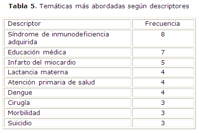 Para determinar las temáticas más abordadas se respetaron los descriptores asignados durante el proceso de indización de la revista por el equipo editorial de esta publicación, quienes utilizan para esto el tesauro DeCS. Para el análisis se tomó solamente el primer descriptor de cada artículo teniendo en cuenta que este representa el tema fundamental (según criterio expresado por el equipo editorial de la publicación) y se determinó la frecuencia en que fue utilizado; de ahí que las temáticas más abordadas a partir de los descriptores son: síndrome de inmunodeficiencia adquirida, educación médica e infarto del miocardio, como se muestra en la tabla 5.