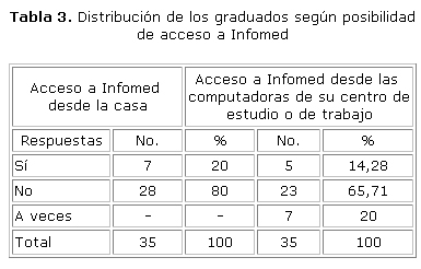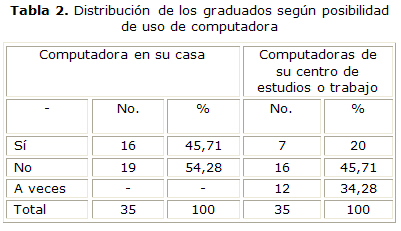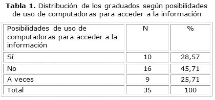 Los estudiantes de Medicina y Estomatología pueden acceder a estas computadoras, así como a las de bibliotecas y centros de educación médica; sin embargo, de los recién graduados de estas carreras, al responder a la encuesta un 45,71 % planteó que no tenía posibilidades de uso de computadoras para acceder a la información. De los estudiantes encuestados un número mayor de la mitad no tiene computadora en casa y un número cercano a la mitad refirió no tener tampoco acceso a estas en su centro de trabajo o estudios.