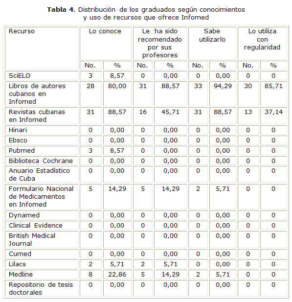 De los recursos que Infomed pone a disposición de sus usuarios, los encuestados refirieron conocer las revistas cubanas y los libros de autores cubanos que están disponibles a texto completo en la red en cifras cercanas al 80 %; le sigue Medline, que es conocido por el 22,86 % de los encuestados, y el Formulario Nacional de Medicamentos en Infomed, por el 14,29 %; SciELO y PubMed por el 8,57 %; Lilacs por el 5,71; Hinari, Ebsco, Biblioteca Cochrane, Anuario Estadístico de Cuba, Dynamed, Clinical Evidence, British Medical Journal, Cumed y el repositorio de tesis doctorales no son conocidos por ninguno de los encuestados (tabla 4).