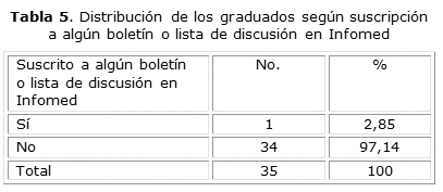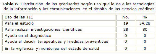 Solo un graduado (2,85 %) está suscrito a una lista de discusión o a un boletín en Infomed (tabla 5). Los entrevistados refirieron usar las TIC para realizar investigaciones científicas (80 %) y para el estudio (54,28 %). No reflejaron su uso como ayuda en el diagnóstico o al decidir terapéuticas y medidas preventivas, ni en la vigilancia y monitoreo del estado de salud (tabla 6), lo cual era de esperarse teniendo en cuenta que se trataba de profesionales recién graduados.