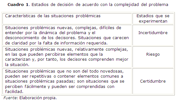Lo primero que se debe destacar es que los decisores se enfrentan a tres estadios emocionales ante situaciones problémicas concretas: certidumbre, riesgo e incertidumbre. De acuerdo con la complejidad de esta situación se podrán relacionar los estadios que estos experimentan (cuadro 1).